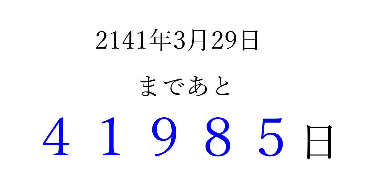 2141年3月29日(水)まで あと 99999 日です 追加すると、トップページからすぐ選べるようになります ※2026/04/16現在の結果です。 最新の状態に更新する ↓シェアして、タイムライン上にカウントダウンを表示しよう!↓ 📤 この結果を共有する Tweet シェア Threads Bluesky 別の日付でカウントダウン 2141年3月のカレンダー このページをブックマークに追加すると、いつでもカウントダウンを確認できます。 (PC: Ctrl+D / Mac: ⌘+D) hitome-notes.comでは以下のページも運営しています。 指定日と期間から日付を計算 | ガチャ確率計算・シミュレーション | プライバシー・ポリシー 運営者:Avocado