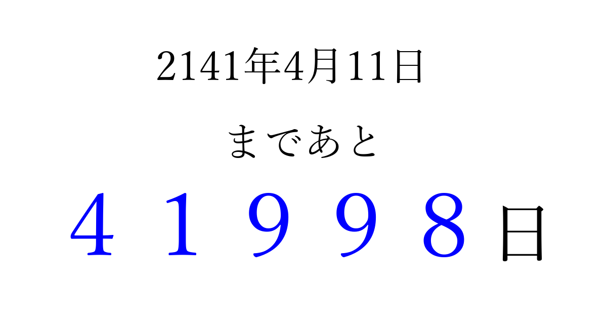 2141年4月11日(火)まで あと 99999 日です 追加すると、トップページからすぐ選べるようになります ※2026/04/16現在の結果です。 最新の状態に更新する ↓シェアして、タイムライン上にカウントダウンを表示しよう!↓ 📤 この結果を共有する Tweet シェア Threads Bluesky 別の日付でカウントダウン 2141年4月のカレンダー このページをブックマークに追加すると、いつでもカウントダウンを確認できます。 (PC: Ctrl+D / Mac: ⌘+D) hitome-notes.comでは以下のページも運営しています。 指定日と期間から日付を計算 | ガチャ確率計算・シミュレーション | プライバシー・ポリシー 運営者:Avocado