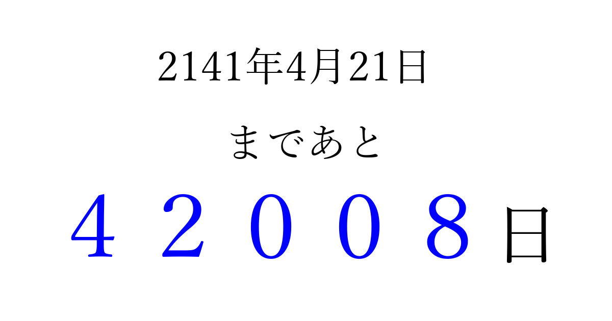 2141年4月21日(金)まで あと 99999 日です 追加すると、トップページからすぐ選べるようになります ※2026/04/16現在の結果です。 最新の状態に更新する ↓シェアして、タイムライン上にカウントダウンを表示しよう!↓ 📤 この結果を共有する Tweet シェア Threads Bluesky 別の日付でカウントダウン 2141年4月のカレンダー このページをブックマークに追加すると、いつでもカウントダウンを確認できます。 (PC: Ctrl+D / Mac: ⌘+D) hitome-notes.comでは以下のページも運営しています。 指定日と期間から日付を計算 | ガチャ確率計算・シミュレーション | プライバシー・ポリシー 運営者:Avocado