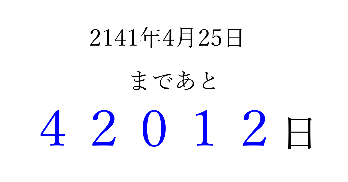 2141年4月25日(火)まで あと 99999 日です 追加すると、トップページからすぐ選べるようになります ※2026/04/16現在の結果です。 最新の状態に更新する ↓シェアして、タイムライン上にカウントダウンを表示しよう!↓ 📤 この結果を共有する Tweet シェア Threads Bluesky 別の日付でカウントダウン 2141年4月のカレンダー このページをブックマークに追加すると、いつでもカウントダウンを確認できます。 (PC: Ctrl+D / Mac: ⌘+D) hitome-notes.comでは以下のページも運営しています。 指定日と期間から日付を計算 | ガチャ確率計算・シミュレーション | プライバシー・ポリシー 運営者:Avocado