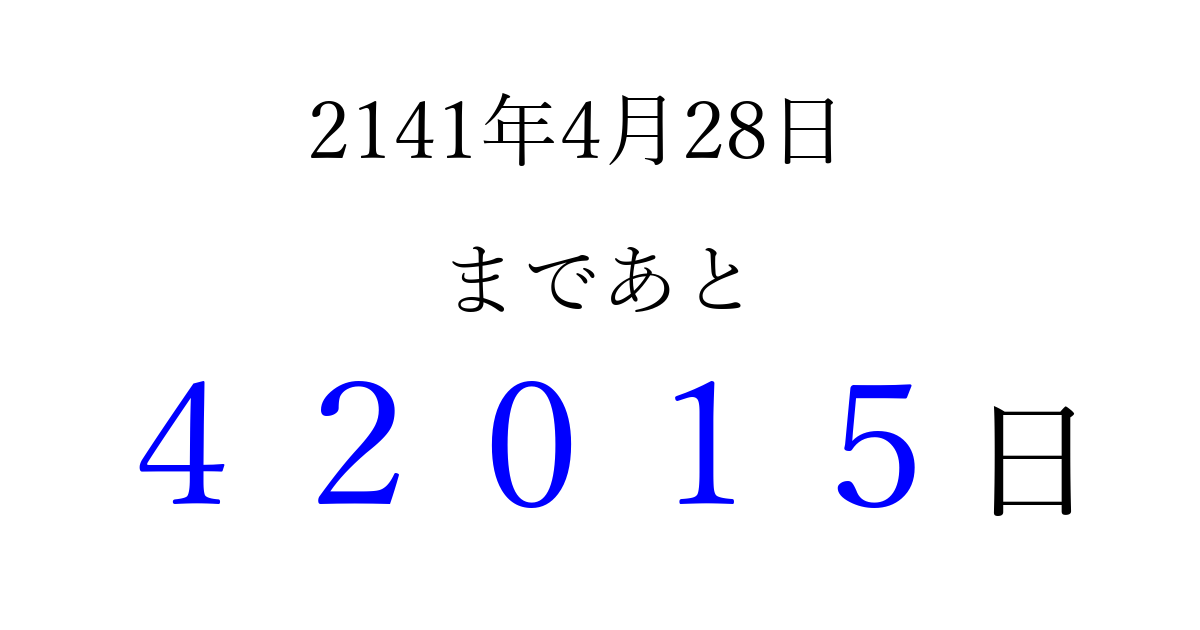 2141年4月28日(金)まで あと 99999 日です 追加すると、トップページからすぐ選べるようになります ※2026/04/16現在の結果です。 最新の状態に更新する ↓シェアして、タイムライン上にカウントダウンを表示しよう!↓ 📤 この結果を共有する Tweet シェア Threads Bluesky 別の日付でカウントダウン 2141年4月のカレンダー このページをブックマークに追加すると、いつでもカウントダウンを確認できます。 (PC: Ctrl+D / Mac: ⌘+D) hitome-notes.comでは以下のページも運営しています。 指定日と期間から日付を計算 | ガチャ確率計算・シミュレーション | プライバシー・ポリシー 運営者:Avocado
