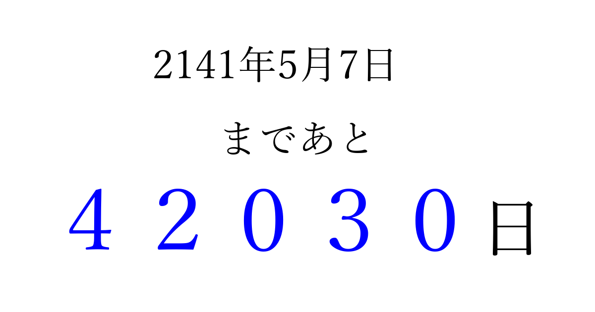 2141年5月7日(日)まで あと 99999 日です 追加すると、トップページからすぐ選べるようになります ※2026/04/10現在の結果です。 最新の状態に更新する ↓シェアして、タイムライン上にカウントダウンを表示しよう!↓ 📤 この結果を共有する Tweet シェア Threads Bluesky 別の日付でカウントダウン 2141年5月のカレンダー このページをブックマークに追加すると、いつでもカウントダウンを確認できます。 (PC: Ctrl+D / Mac: ⌘+D) hitome-notes.comでは以下のページも運営しています。 指定日と期間から日付を計算 | ガチャ確率計算・シミュレーション | プライバシー・ポリシー 運営者:Avocado