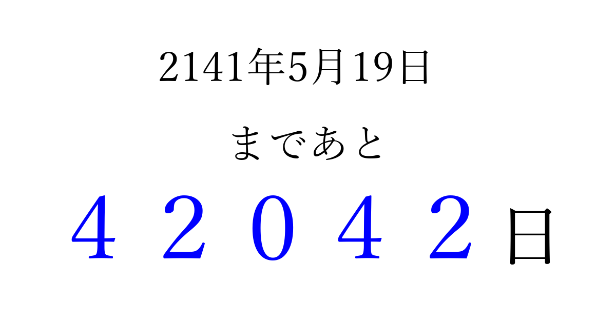 2141年5月19日(金)まで あと 99999 日です 追加すると、トップページからすぐ選べるようになります ※2026/04/10現在の結果です。 最新の状態に更新する ↓シェアして、タイムライン上にカウントダウンを表示しよう!↓ 📤 この結果を共有する Tweet シェア Threads Bluesky 別の日付でカウントダウン 2141年5月のカレンダー このページをブックマークに追加すると、いつでもカウントダウンを確認できます。 (PC: Ctrl+D / Mac: ⌘+D) hitome-notes.comでは以下のページも運営しています。 指定日と期間から日付を計算 | ガチャ確率計算・シミュレーション | プライバシー・ポリシー 運営者:Avocado