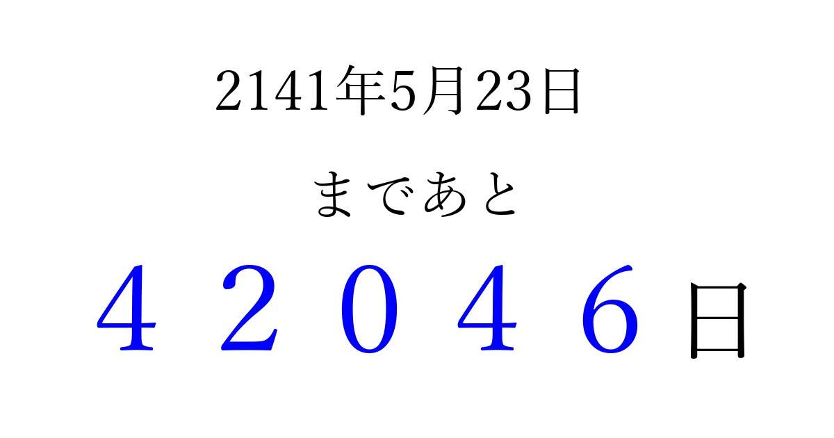 2141年5月23日(火)まで あと 99999 日です 追加すると、トップページからすぐ選べるようになります ※2026/04/10現在の結果です。 最新の状態に更新する ↓シェアして、タイムライン上にカウントダウンを表示しよう!↓ 📤 この結果を共有する Tweet シェア Threads Bluesky 別の日付でカウントダウン 2141年5月のカレンダー このページをブックマークに追加すると、いつでもカウントダウンを確認できます。 (PC: Ctrl+D / Mac: ⌘+D) hitome-notes.comでは以下のページも運営しています。 指定日と期間から日付を計算 | ガチャ確率計算・シミュレーション | プライバシー・ポリシー 運営者:Avocado