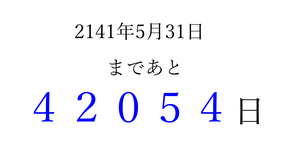 2141年5月31日(水)まで あと 99999 日です 追加すると、トップページからすぐ選べるようになります ※2026/04/10現在の結果です。 最新の状態に更新する ↓シェアして、タイムライン上にカウントダウンを表示しよう!↓ 📤 この結果を共有する Tweet シェア Threads Bluesky 別の日付でカウントダウン 2141年5月のカレンダー このページをブックマークに追加すると、いつでもカウントダウンを確認できます。 (PC: Ctrl+D / Mac: ⌘+D) hitome-notes.comでは以下のページも運営しています。 指定日と期間から日付を計算 | ガチャ確率計算・シミュレーション | プライバシー・ポリシー 運営者:Avocado