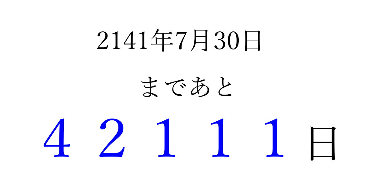 2141年7月30日(日)まで あと 99999 日です 追加すると、トップページからすぐ選べるようになります ※2026/04/13現在の結果です。 最新の状態に更新する ↓シェアして、タイムライン上にカウントダウンを表示しよう!↓ 📤 この結果を共有する Tweet シェア Threads Bluesky 別の日付でカウントダウン 2141年7月のカレンダー このページをブックマークに追加すると、いつでもカウントダウンを確認できます。 (PC: Ctrl+D / Mac: ⌘+D) hitome-notes.comでは以下のページも運営しています。 指定日と期間から日付を計算 | ガチャ確率計算・シミュレーション | プライバシー・ポリシー 運営者:Avocado