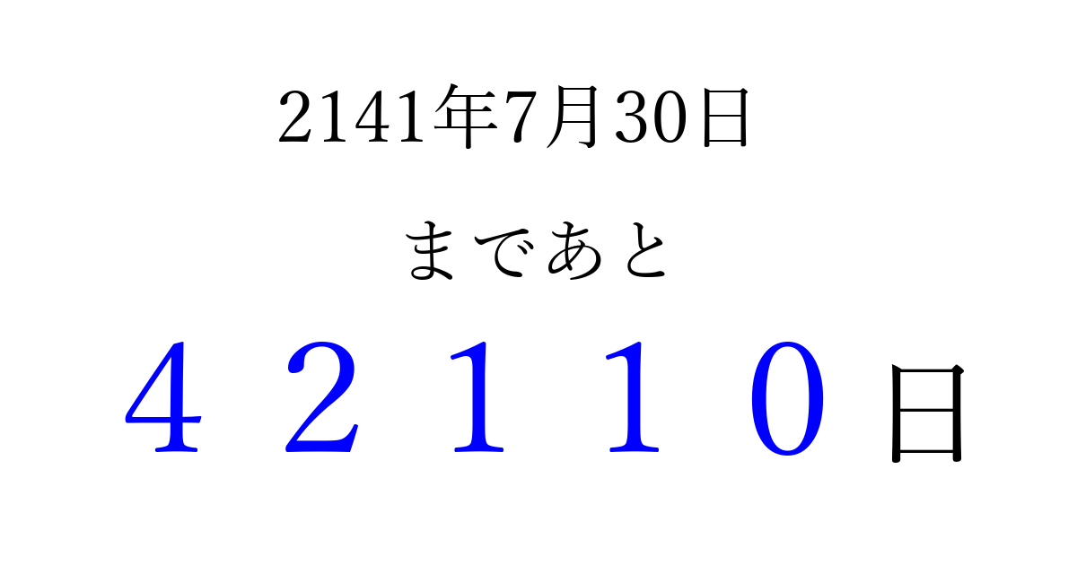 2141年7月30日(日)まで あと 99999 日です 追加すると、トップページからすぐ選べるようになります ※2026/04/14現在の結果です。 最新の状態に更新する ↓シェアして、タイムライン上にカウントダウンを表示しよう!↓ 📤 この結果を共有する Tweet シェア Threads Bluesky 別の日付でカウントダウン 2141年7月のカレンダー このページをブックマークに追加すると、いつでもカウントダウンを確認できます。 (PC: Ctrl+D / Mac: ⌘+D) hitome-notes.comでは以下のページも運営しています。 指定日と期間から日付を計算 | ガチャ確率計算・シミュレーション | プライバシー・ポリシー 運営者:Avocado