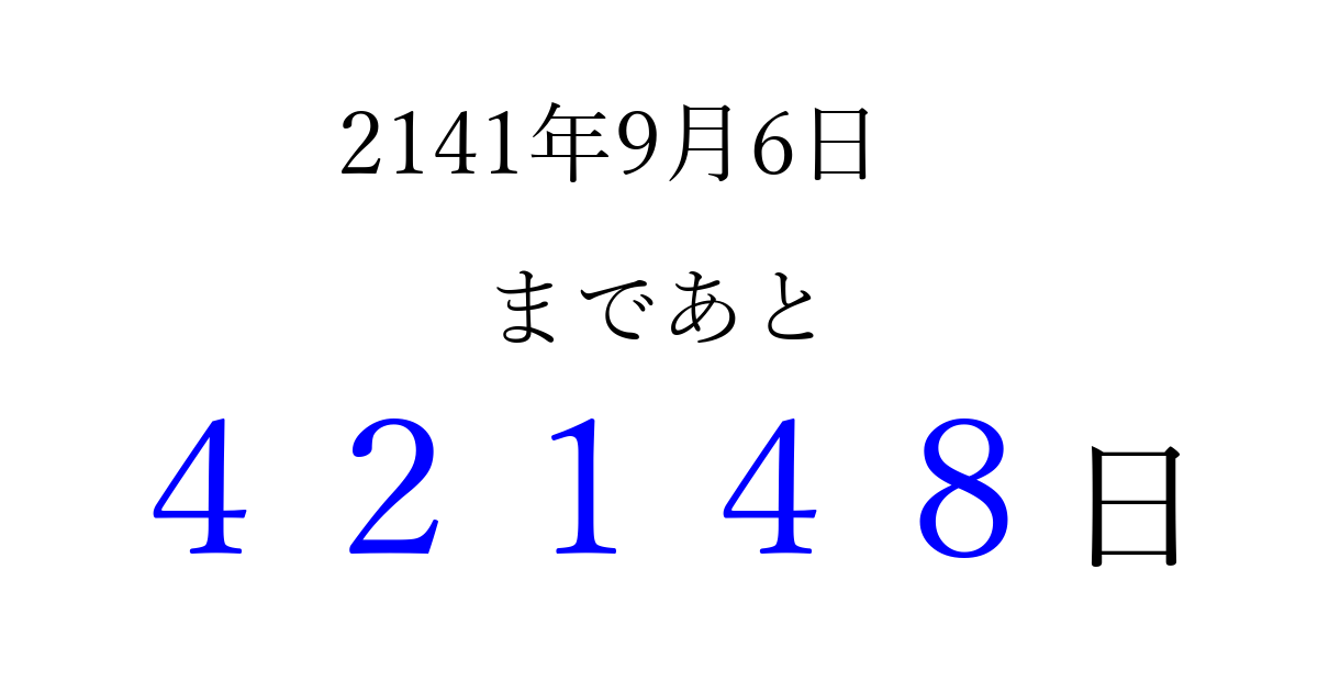 2141年9月6日(水)まで あと 99999 日です 追加すると、トップページからすぐ選べるようになります ※2026/04/14現在の結果です。 最新の状態に更新する ↓シェアして、タイムライン上にカウントダウンを表示しよう!↓ 📤 この結果を共有する Tweet シェア Threads Bluesky 別の日付でカウントダウン 2141年9月のカレンダー このページをブックマークに追加すると、いつでもカウントダウンを確認できます。 (PC: Ctrl+D / Mac: ⌘+D) hitome-notes.comでは以下のページも運営しています。 指定日と期間から日付を計算 | ガチャ確率計算・シミュレーション | プライバシー・ポリシー 運営者:Avocado