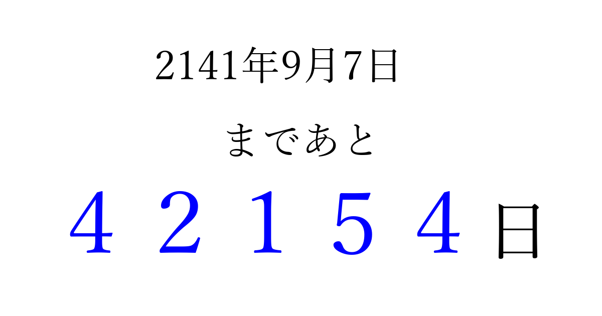 2141年9月7日(木)まで あと 99999 日です 追加すると、トップページからすぐ選べるようになります ※2026/04/09現在の結果です。 最新の状態に更新する ↓シェアして、タイムライン上にカウントダウンを表示しよう!↓ 📤 この結果を共有する Tweet シェア Threads Bluesky 別の日付でカウントダウン 2141年9月のカレンダー このページをブックマークに追加すると、いつでもカウントダウンを確認できます。 (PC: Ctrl+D / Mac: ⌘+D) hitome-notes.comでは以下のページも運営しています。 指定日と期間から日付を計算 | ガチャ確率計算・シミュレーション | プライバシー・ポリシー 運営者:Avocado