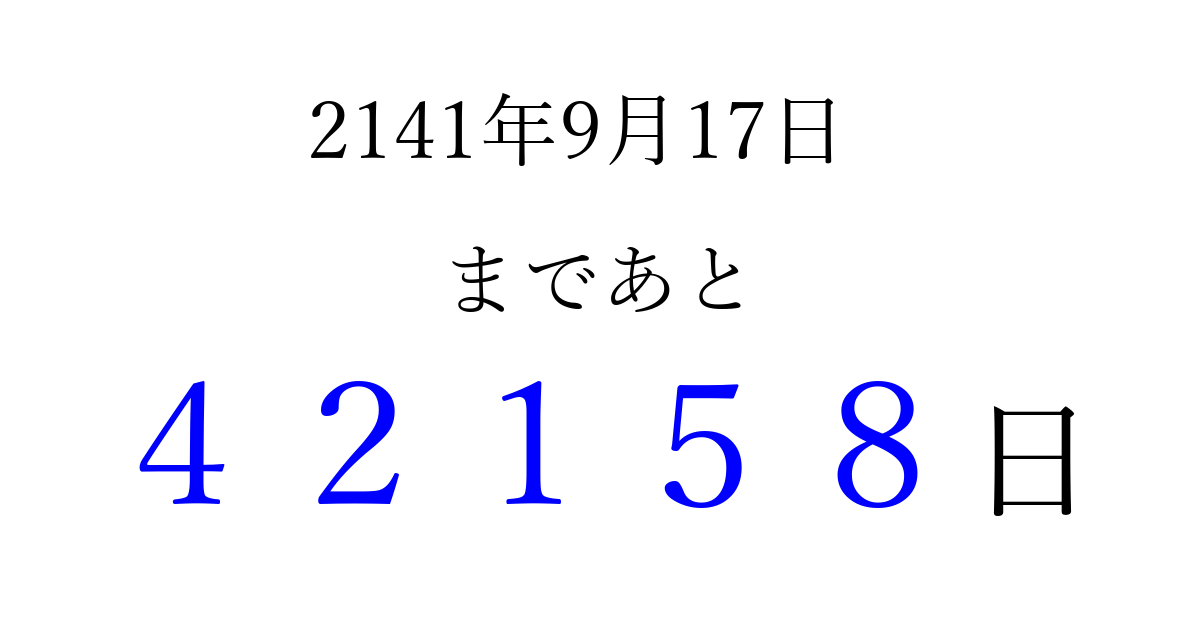 2141年9月17日(日)まで あと 99999 日です 追加すると、トップページからすぐ選べるようになります ※2026/04/15現在の結果です。 最新の状態に更新する ↓シェアして、タイムライン上にカウントダウンを表示しよう!↓ 📤 この結果を共有する Tweet シェア Threads Bluesky 別の日付でカウントダウン 2141年9月のカレンダー このページをブックマークに追加すると、いつでもカウントダウンを確認できます。 (PC: Ctrl+D / Mac: ⌘+D) hitome-notes.comでは以下のページも運営しています。 指定日と期間から日付を計算 | ガチャ確率計算・シミュレーション | プライバシー・ポリシー 運営者:Avocado