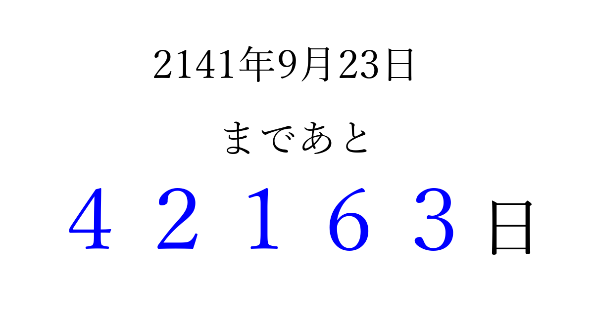 2141年9月23日(土)まで あと 99999 日です 追加すると、トップページからすぐ選べるようになります ※2026/04/15現在の結果です。 最新の状態に更新する ↓シェアして、タイムライン上にカウントダウンを表示しよう!↓ 📤 この結果を共有する Tweet シェア Threads Bluesky 別の日付でカウントダウン 2141年9月のカレンダー このページをブックマークに追加すると、いつでもカウントダウンを確認できます。 (PC: Ctrl+D / Mac: ⌘+D) hitome-notes.comでは以下のページも運営しています。 指定日と期間から日付を計算 | ガチャ確率計算・シミュレーション | プライバシー・ポリシー 運営者:Avocado