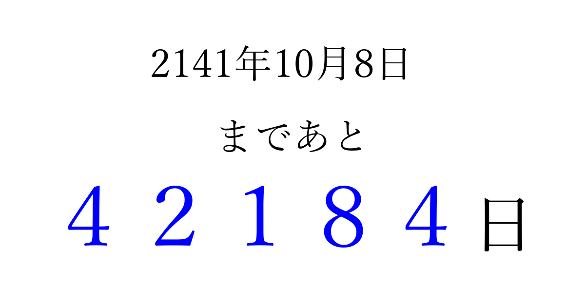 2141年10月8日(日)まで あと 99999 日です 追加すると、トップページからすぐ選べるようになります ※2026/04/10現在の結果です。 最新の状態に更新する ↓シェアして、タイムライン上にカウントダウンを表示しよう!↓ 📤 この結果を共有する Tweet シェア Threads Bluesky 別の日付でカウントダウン 2141年10月のカレンダー このページをブックマークに追加すると、いつでもカウントダウンを確認できます。 (PC: Ctrl+D / Mac: ⌘+D) hitome-notes.comでは以下のページも運営しています。 指定日と期間から日付を計算 | ガチャ確率計算・シミュレーション | プライバシー・ポリシー 運営者:Avocado
