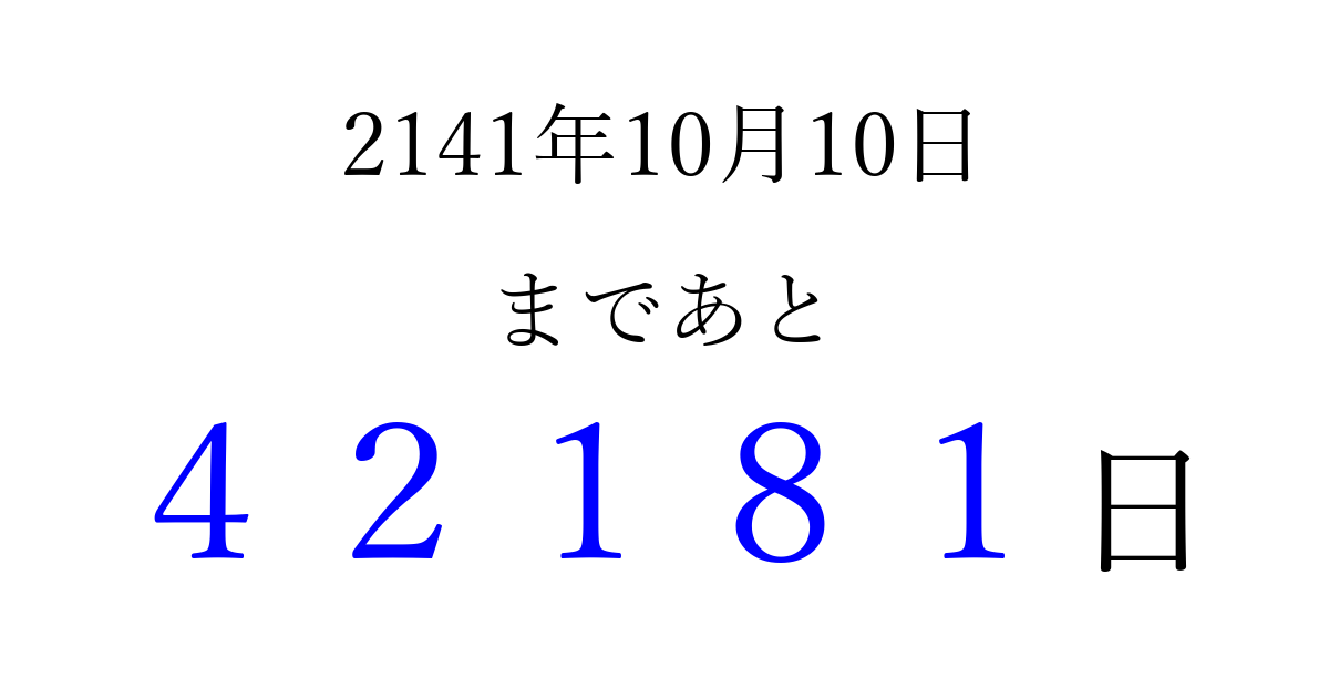 2141年10月10日(火)まで あと 99999 日です 追加すると、トップページからすぐ選べるようになります ※2026/04/15現在の結果です。 最新の状態に更新する ↓シェアして、タイムライン上にカウントダウンを表示しよう!↓ 📤 この結果を共有する Tweet シェア Threads Bluesky 別の日付でカウントダウン 2141年10月のカレンダー このページをブックマークに追加すると、いつでもカウントダウンを確認できます。 (PC: Ctrl+D / Mac: ⌘+D) hitome-notes.comでは以下のページも運営しています。 指定日と期間から日付を計算 | ガチャ確率計算・シミュレーション | プライバシー・ポリシー 運営者:Avocado