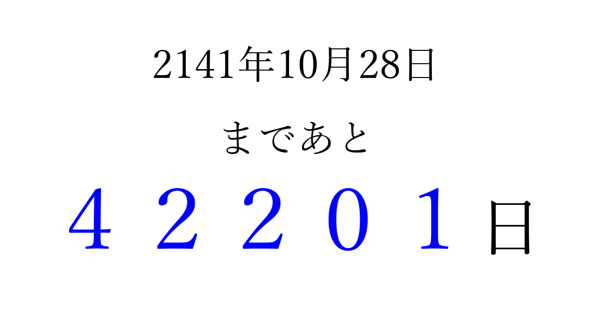 2141年10月28日(土)まで あと 99999 日です 追加すると、トップページからすぐ選べるようになります ※2026/04/13現在の結果です。 最新の状態に更新する ↓シェアして、タイムライン上にカウントダウンを表示しよう!↓ 📤 この結果を共有する Tweet シェア Threads Bluesky 別の日付でカウントダウン 2141年10月のカレンダー このページをブックマークに追加すると、いつでもカウントダウンを確認できます。 (PC: Ctrl+D / Mac: ⌘+D) hitome-notes.comでは以下のページも運営しています。 指定日と期間から日付を計算 | ガチャ確率計算・シミュレーション | プライバシー・ポリシー 運営者:Avocado