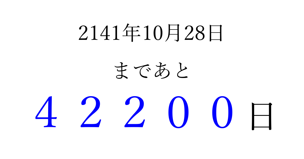2141年10月28日(土)まで あと 99999 日です 追加すると、トップページからすぐ選べるようになります ※2026/04/14現在の結果です。 最新の状態に更新する ↓シェアして、タイムライン上にカウントダウンを表示しよう!↓ 📤 この結果を共有する Tweet シェア Threads Bluesky 別の日付でカウントダウン 2141年10月のカレンダー このページをブックマークに追加すると、いつでもカウントダウンを確認できます。 (PC: Ctrl+D / Mac: ⌘+D) hitome-notes.comでは以下のページも運営しています。 指定日と期間から日付を計算 | ガチャ確率計算・シミュレーション | プライバシー・ポリシー 運営者:Avocado