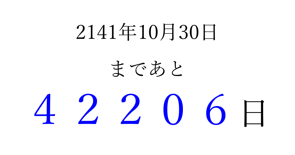 2141年10月30日(月)まで あと 99999 日です 追加すると、トップページからすぐ選べるようになります ※2026/04/10現在の結果です。 最新の状態に更新する ↓シェアして、タイムライン上にカウントダウンを表示しよう!↓ 📤 この結果を共有する Tweet シェア Threads Bluesky 別の日付でカウントダウン 2141年10月のカレンダー このページをブックマークに追加すると、いつでもカウントダウンを確認できます。 (PC: Ctrl+D / Mac: ⌘+D) hitome-notes.comでは以下のページも運営しています。 指定日と期間から日付を計算 | ガチャ確率計算・シミュレーション | プライバシー・ポリシー 運営者:Avocado