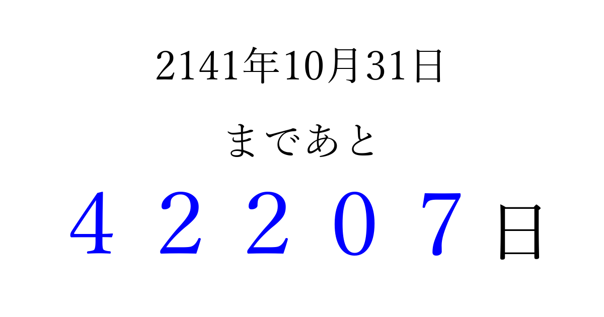 2141年10月31日(火)まで あと 99999 日です 追加すると、トップページからすぐ選べるようになります ※2026/04/10現在の結果です。 最新の状態に更新する ↓シェアして、タイムライン上にカウントダウンを表示しよう!↓ 📤 この結果を共有する Tweet シェア Threads Bluesky 別の日付でカウントダウン 2141年10月のカレンダー このページをブックマークに追加すると、いつでもカウントダウンを確認できます。 (PC: Ctrl+D / Mac: ⌘+D) hitome-notes.comでは以下のページも運営しています。 指定日と期間から日付を計算 | ガチャ確率計算・シミュレーション | プライバシー・ポリシー 運営者:Avocado
