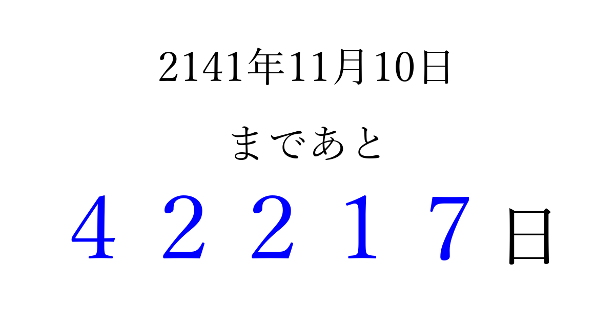 2141年11月10日(金)まで あと 99999 日です 追加すると、トップページからすぐ選べるようになります ※2026/04/10現在の結果です。 最新の状態に更新する ↓シェアして、タイムライン上にカウントダウンを表示しよう!↓ 📤 この結果を共有する Tweet シェア Threads Bluesky 別の日付でカウントダウン 2141年11月のカレンダー このページをブックマークに追加すると、いつでもカウントダウンを確認できます。 (PC: Ctrl+D / Mac: ⌘+D) hitome-notes.comでは以下のページも運営しています。 指定日と期間から日付を計算 | ガチャ確率計算・シミュレーション | プライバシー・ポリシー 運営者:Avocado