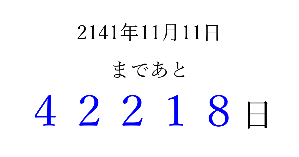 2141年11月11日(土)まで あと 99999 日です 追加すると、トップページからすぐ選べるようになります ※2026/04/10現在の結果です。 最新の状態に更新する ↓シェアして、タイムライン上にカウントダウンを表示しよう!↓ 📤 この結果を共有する Tweet シェア Threads Bluesky 別の日付でカウントダウン 2141年11月のカレンダー このページをブックマークに追加すると、いつでもカウントダウンを確認できます。 (PC: Ctrl+D / Mac: ⌘+D) hitome-notes.comでは以下のページも運営しています。 指定日と期間から日付を計算 | ガチャ確率計算・シミュレーション | プライバシー・ポリシー 運営者:Avocado