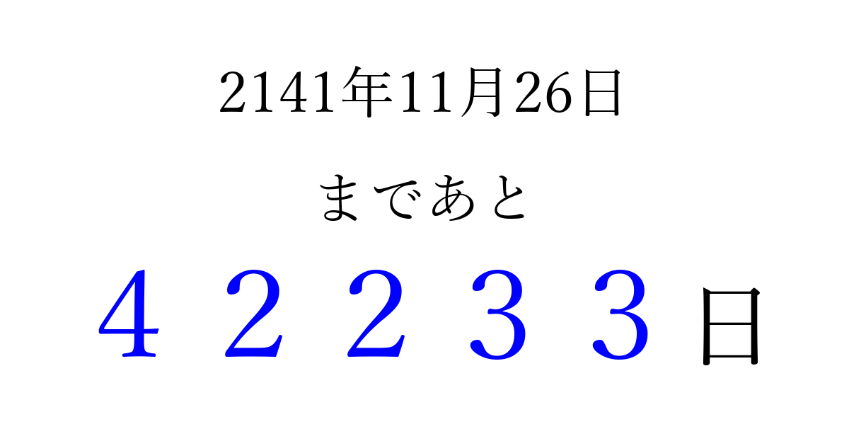 2141年11月26日(日)まで あと 99999 日です 追加すると、トップページからすぐ選べるようになります ※2026/04/10現在の結果です。 最新の状態に更新する ↓シェアして、タイムライン上にカウントダウンを表示しよう!↓ 📤 この結果を共有する Tweet シェア Threads Bluesky 別の日付でカウントダウン 2141年11月のカレンダー このページをブックマークに追加すると、いつでもカウントダウンを確認できます。 (PC: Ctrl+D / Mac: ⌘+D) hitome-notes.comでは以下のページも運営しています。 指定日と期間から日付を計算 | ガチャ確率計算・シミュレーション | プライバシー・ポリシー 運営者:Avocado