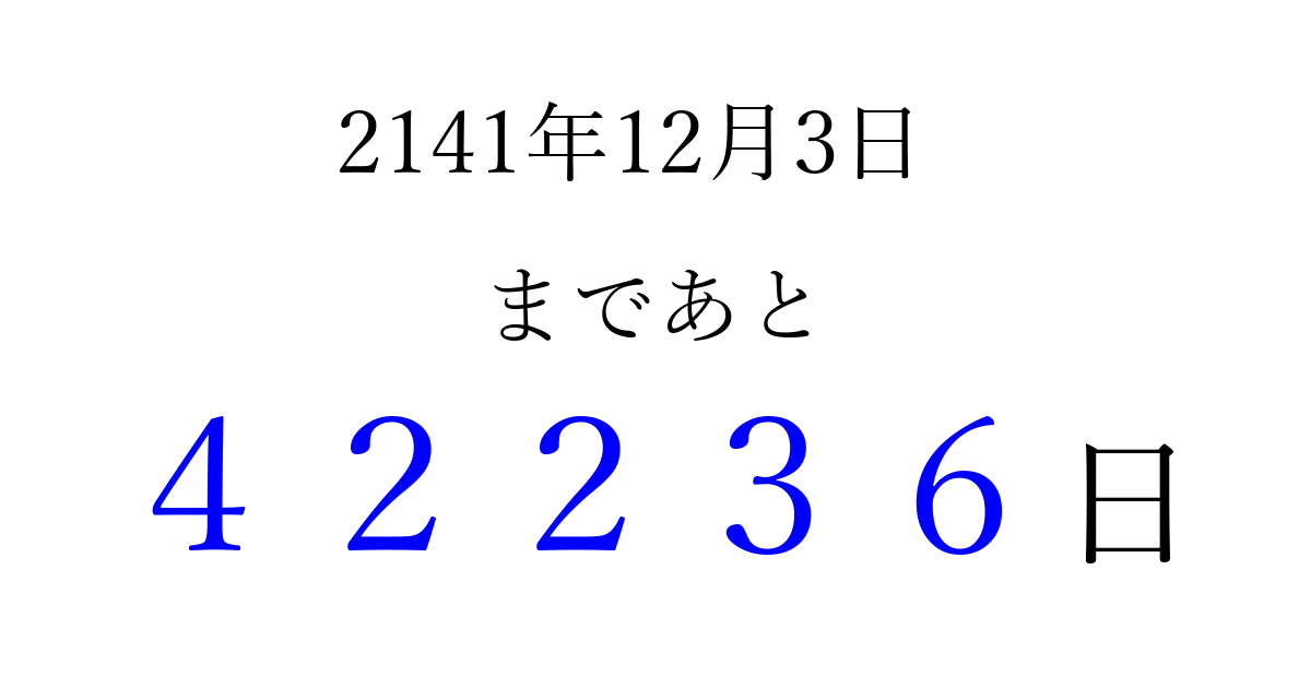 2141年12月3日(日)まで あと 99999 日です 追加すると、トップページからすぐ選べるようになります ※2026/04/14現在の結果です。 最新の状態に更新する ↓シェアして、タイムライン上にカウントダウンを表示しよう!↓ 📤 この結果を共有する Tweet シェア Threads Bluesky 別の日付でカウントダウン 2141年12月のカレンダー このページをブックマークに追加すると、いつでもカウントダウンを確認できます。 (PC: Ctrl+D / Mac: ⌘+D) hitome-notes.comでは以下のページも運営しています。 指定日と期間から日付を計算 | ガチャ確率計算・シミュレーション | プライバシー・ポリシー 運営者:Avocado