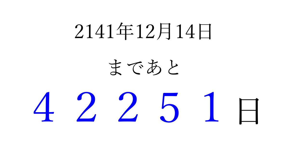 2141年12月14日(木)まで あと 99999 日です 追加すると、トップページからすぐ選べるようになります ※2026/04/10現在の結果です。 最新の状態に更新する ↓シェアして、タイムライン上にカウントダウンを表示しよう!↓ 📤 この結果を共有する Tweet シェア Threads Bluesky 別の日付でカウントダウン 2141年12月のカレンダー このページをブックマークに追加すると、いつでもカウントダウンを確認できます。 (PC: Ctrl+D / Mac: ⌘+D) hitome-notes.comでは以下のページも運営しています。 指定日と期間から日付を計算 | ガチャ確率計算・シミュレーション | プライバシー・ポリシー 運営者:Avocado