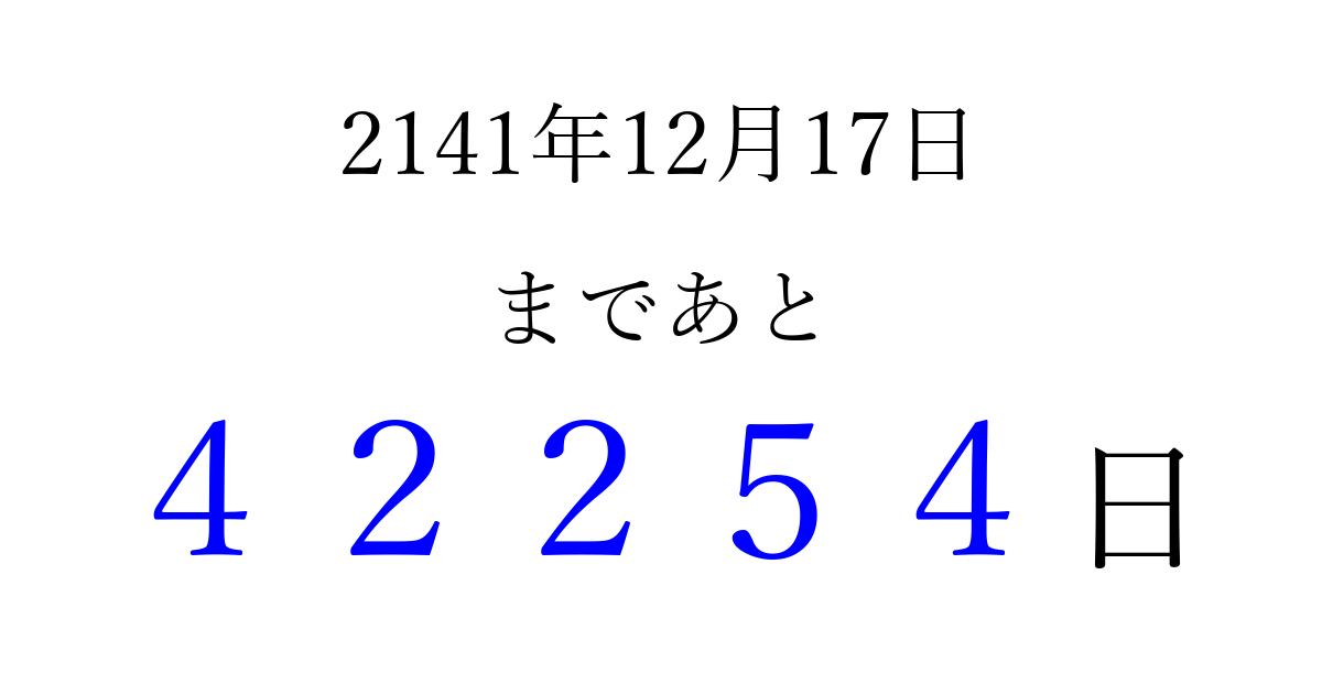 2141年12月17日(日)まで あと 99999 日です 追加すると、トップページからすぐ選べるようになります ※2026/04/10現在の結果です。 最新の状態に更新する ↓シェアして、タイムライン上にカウントダウンを表示しよう!↓ 📤 この結果を共有する Tweet シェア Threads Bluesky 別の日付でカウントダウン 2141年12月のカレンダー このページをブックマークに追加すると、いつでもカウントダウンを確認できます。 (PC: Ctrl+D / Mac: ⌘+D) hitome-notes.comでは以下のページも運営しています。 指定日と期間から日付を計算 | ガチャ確率計算・シミュレーション | プライバシー・ポリシー 運営者:Avocado