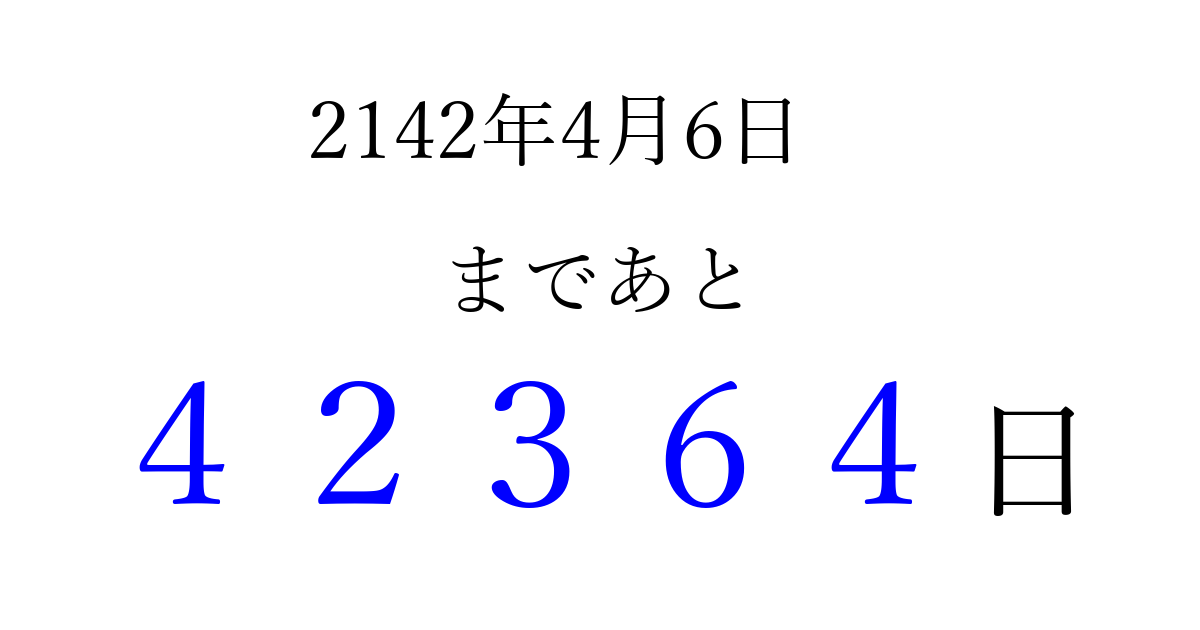 2142年4月6日(金)まで あと 99999 日です 追加すると、トップページからすぐ選べるようになります ※2026/04/10現在の結果です。 最新の状態に更新する ↓シェアして、タイムライン上にカウントダウンを表示しよう!↓ 📤 この結果を共有する Tweet シェア Threads Bluesky 別の日付でカウントダウン 2142年4月のカレンダー このページをブックマークに追加すると、いつでもカウントダウンを確認できます。 (PC: Ctrl+D / Mac: ⌘+D) hitome-notes.comでは以下のページも運営しています。 指定日と期間から日付を計算 | ガチャ確率計算・シミュレーション | プライバシー・ポリシー 運営者:Avocado