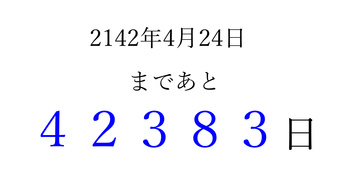 2142年4月24日(火)まで あと 99999 日です 追加すると、トップページからすぐ選べるようになります ※2026/04/09現在の結果です。 最新の状態に更新する ↓シェアして、タイムライン上にカウントダウンを表示しよう!↓ 📤 この結果を共有する Tweet シェア Threads Bluesky 別の日付でカウントダウン 2142年4月のカレンダー このページをブックマークに追加すると、いつでもカウントダウンを確認できます。 (PC: Ctrl+D / Mac: ⌘+D) hitome-notes.comでは以下のページも運営しています。 指定日と期間から日付を計算 | ガチャ確率計算・シミュレーション | プライバシー・ポリシー 運営者:Avocado