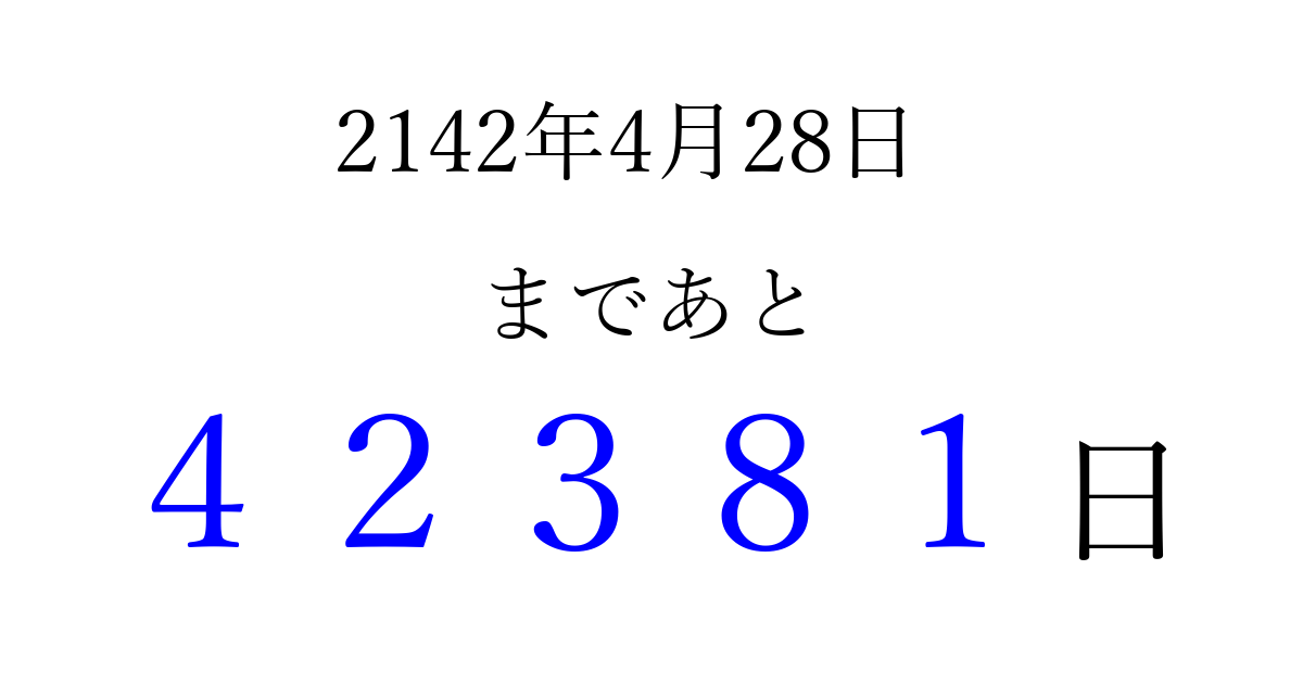 2142年4月28日(土)まで あと 99999 日です 追加すると、トップページからすぐ選べるようになります ※2026/04/15現在の結果です。 最新の状態に更新する ↓シェアして、タイムライン上にカウントダウンを表示しよう!↓ 📤 この結果を共有する Tweet シェア Threads Bluesky 別の日付でカウントダウン 2142年4月のカレンダー このページをブックマークに追加すると、いつでもカウントダウンを確認できます。 (PC: Ctrl+D / Mac: ⌘+D) hitome-notes.comでは以下のページも運営しています。 指定日と期間から日付を計算 | ガチャ確率計算・シミュレーション | プライバシー・ポリシー 運営者:Avocado