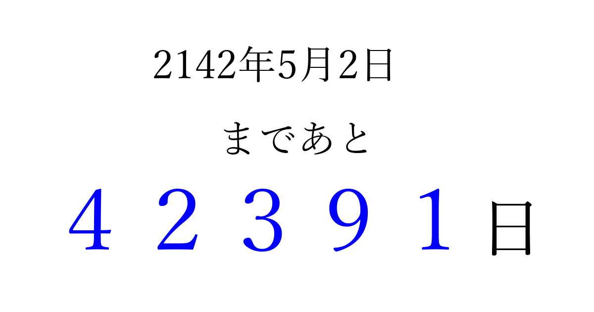 2142年5月2日(水)まで あと 99999 日です 追加すると、トップページからすぐ選べるようになります ※2026/04/09現在の結果です。 最新の状態に更新する ↓シェアして、タイムライン上にカウントダウンを表示しよう!↓ 📤 この結果を共有する Tweet シェア Threads Bluesky 別の日付でカウントダウン 2142年5月のカレンダー このページをブックマークに追加すると、いつでもカウントダウンを確認できます。 (PC: Ctrl+D / Mac: ⌘+D) hitome-notes.comでは以下のページも運営しています。 指定日と期間から日付を計算 | ガチャ確率計算・シミュレーション | プライバシー・ポリシー 運営者:Avocado