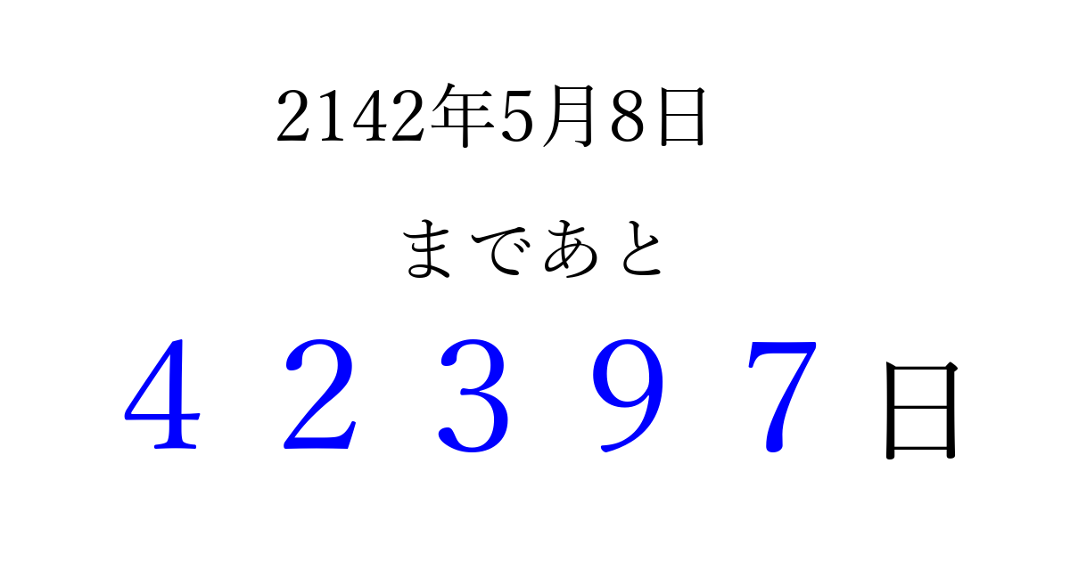 2142年5月8日(火)まで あと 99999 日です 追加すると、トップページからすぐ選べるようになります ※2026/04/09現在の結果です。 最新の状態に更新する ↓シェアして、タイムライン上にカウントダウンを表示しよう!↓ 📤 この結果を共有する Tweet シェア Threads Bluesky 別の日付でカウントダウン 2142年5月のカレンダー このページをブックマークに追加すると、いつでもカウントダウンを確認できます。 (PC: Ctrl+D / Mac: ⌘+D) hitome-notes.comでは以下のページも運営しています。 指定日と期間から日付を計算 | ガチャ確率計算・シミュレーション | プライバシー・ポリシー 運営者:Avocado