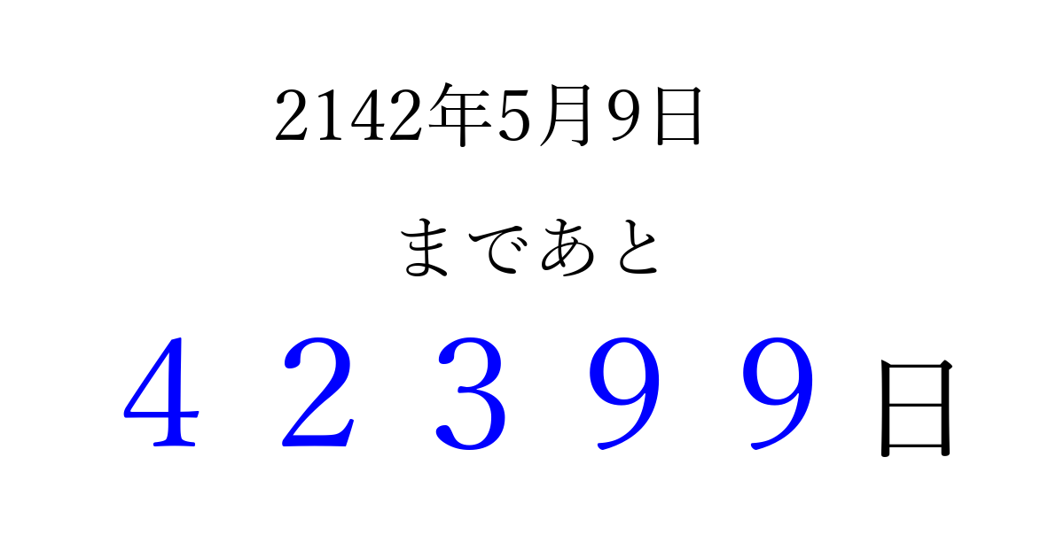 2142年5月9日(水)まで あと 99999 日です 追加すると、トップページからすぐ選べるようになります ※2026/04/08現在の結果です。 最新の状態に更新する ↓シェアして、タイムライン上にカウントダウンを表示しよう!↓ 📤 この結果を共有する Tweet シェア Threads Bluesky 別の日付でカウントダウン 2142年5月のカレンダー このページをブックマークに追加すると、いつでもカウントダウンを確認できます。 (PC: Ctrl+D / Mac: ⌘+D) hitome-notes.comでは以下のページも運営しています。 指定日と期間から日付を計算 | ガチャ確率計算・シミュレーション | プライバシー・ポリシー 運営者:Avocado