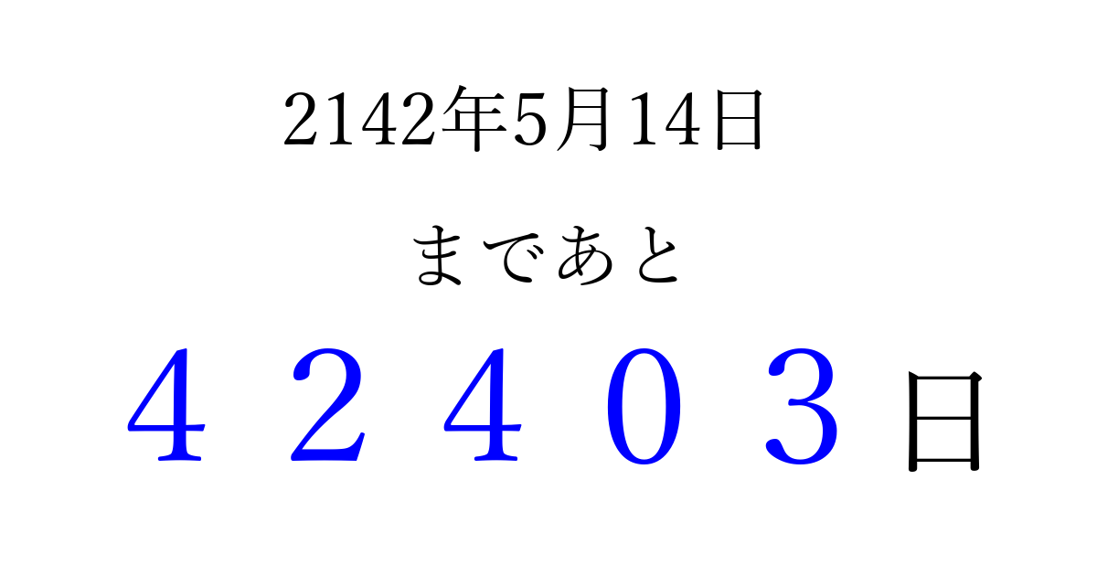 2142年5月14日(月)まで あと 99999 日です 追加すると、トップページからすぐ選べるようになります ※2026/04/09現在の結果です。 最新の状態に更新する ↓シェアして、タイムライン上にカウントダウンを表示しよう!↓ 📤 この結果を共有する Tweet シェア Threads Bluesky 別の日付でカウントダウン 2142年5月のカレンダー このページをブックマークに追加すると、いつでもカウントダウンを確認できます。 (PC: Ctrl+D / Mac: ⌘+D) hitome-notes.comでは以下のページも運営しています。 指定日と期間から日付を計算 | ガチャ確率計算・シミュレーション | プライバシー・ポリシー 運営者:Avocado