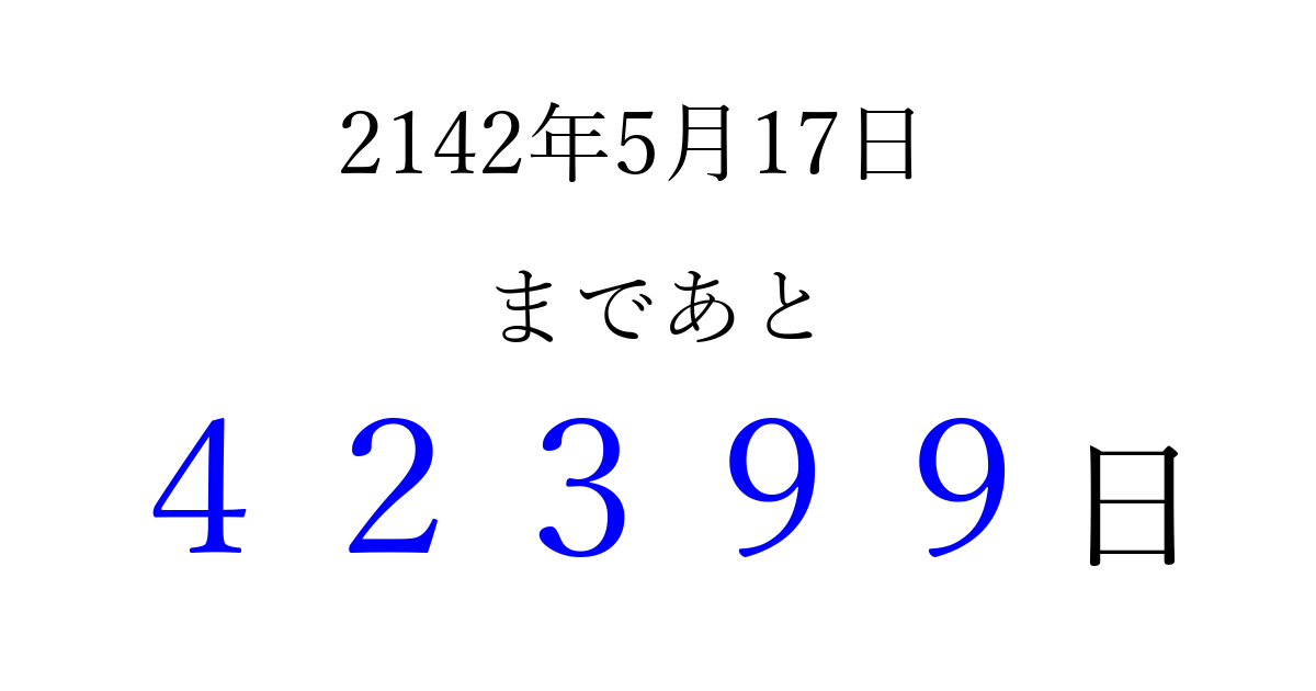 2142年5月17日(木)まで あと 99999 日です 追加すると、トップページからすぐ選べるようになります ※2026/04/16現在の結果です。 最新の状態に更新する ↓シェアして、タイムライン上にカウントダウンを表示しよう!↓ 📤 この結果を共有する Tweet シェア Threads Bluesky 別の日付でカウントダウン 2142年5月のカレンダー このページをブックマークに追加すると、いつでもカウントダウンを確認できます。 (PC: Ctrl+D / Mac: ⌘+D) hitome-notes.comでは以下のページも運営しています。 指定日と期間から日付を計算 | ガチャ確率計算・シミュレーション | プライバシー・ポリシー 運営者:Avocado