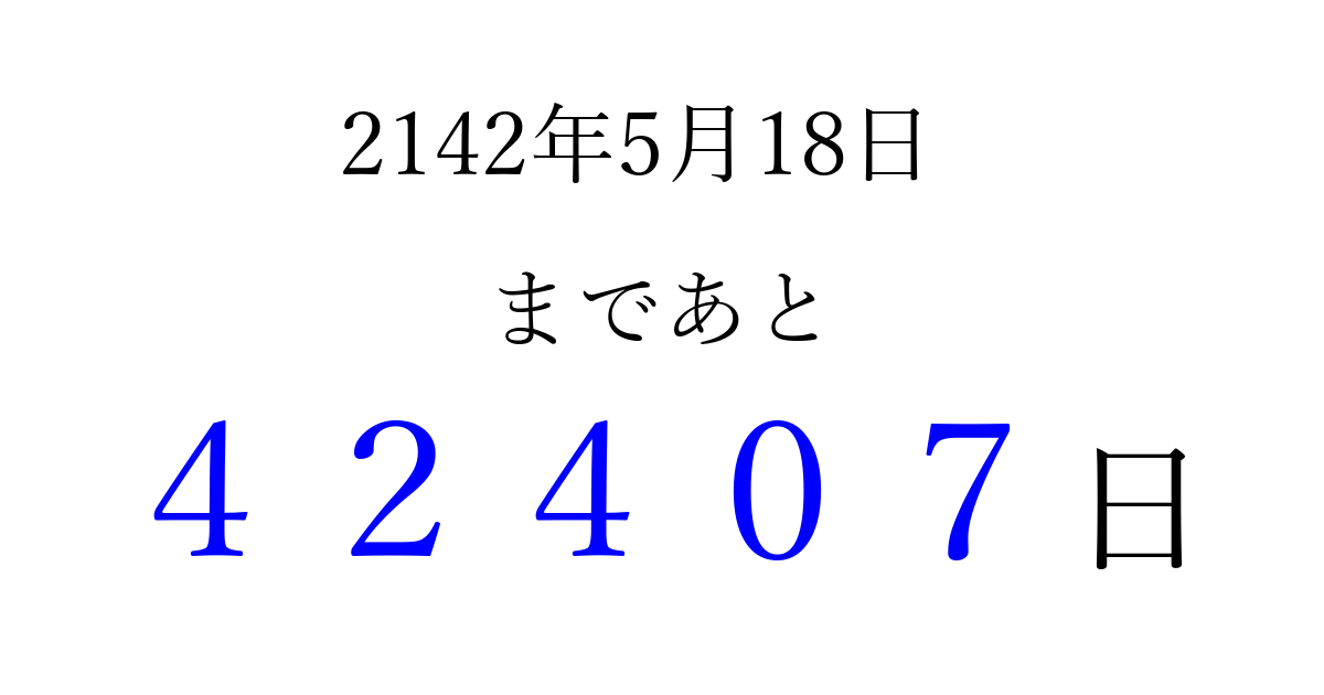 2142年5月18日(金)まで あと 99999 日です 追加すると、トップページからすぐ選べるようになります ※2026/04/09現在の結果です。 最新の状態に更新する ↓シェアして、タイムライン上にカウントダウンを表示しよう!↓ 📤 この結果を共有する Tweet シェア Threads Bluesky 別の日付でカウントダウン 2142年5月のカレンダー このページをブックマークに追加すると、いつでもカウントダウンを確認できます。 (PC: Ctrl+D / Mac: ⌘+D) hitome-notes.comでは以下のページも運営しています。 指定日と期間から日付を計算 | ガチャ確率計算・シミュレーション | プライバシー・ポリシー 運営者:Avocado