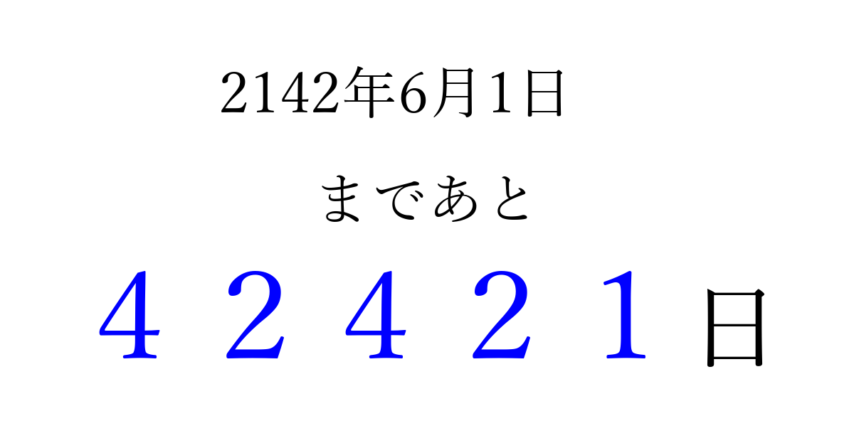 2142年6月1日(金)まで あと 99999 日です 追加すると、トップページからすぐ選べるようになります ※2026/04/09現在の結果です。 最新の状態に更新する ↓シェアして、タイムライン上にカウントダウンを表示しよう!↓ 📤 この結果を共有する Tweet シェア Threads Bluesky 別の日付でカウントダウン 2142年6月のカレンダー このページをブックマークに追加すると、いつでもカウントダウンを確認できます。 (PC: Ctrl+D / Mac: ⌘+D) hitome-notes.comでは以下のページも運営しています。 指定日と期間から日付を計算 | ガチャ確率計算・シミュレーション | プライバシー・ポリシー 運営者:Avocado