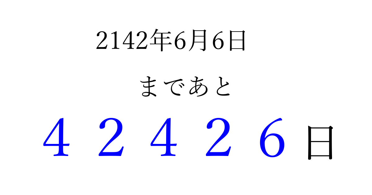 2142年6月6日(水)まで あと 99999 日です 追加すると、トップページからすぐ選べるようになります ※2026/04/09現在の結果です。 最新の状態に更新する ↓シェアして、タイムライン上にカウントダウンを表示しよう!↓ 📤 この結果を共有する Tweet シェア Threads Bluesky 別の日付でカウントダウン 2142年6月のカレンダー このページをブックマークに追加すると、いつでもカウントダウンを確認できます。 (PC: Ctrl+D / Mac: ⌘+D) hitome-notes.comでは以下のページも運営しています。 指定日と期間から日付を計算 | ガチャ確率計算・シミュレーション | プライバシー・ポリシー 運営者:Avocado