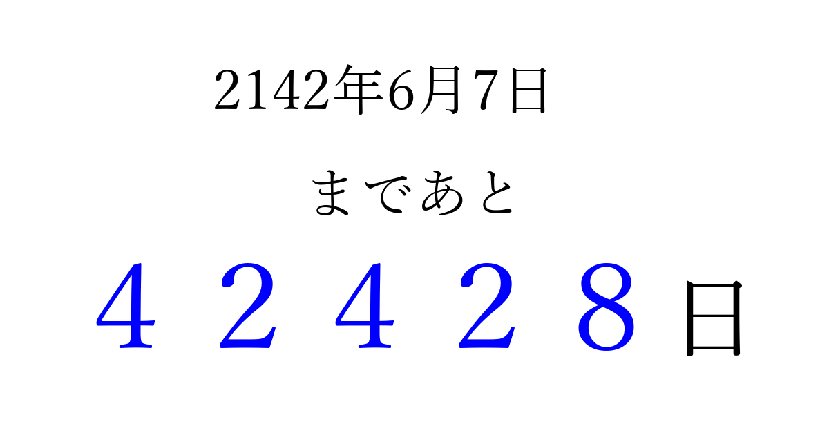 2142年6月7日(木)まで あと 99999 日です 追加すると、トップページからすぐ選べるようになります ※2026/04/08現在の結果です。 最新の状態に更新する ↓シェアして、タイムライン上にカウントダウンを表示しよう!↓ 📤 この結果を共有する Tweet シェア Threads Bluesky 別の日付でカウントダウン 2142年6月のカレンダー このページをブックマークに追加すると、いつでもカウントダウンを確認できます。 (PC: Ctrl+D / Mac: ⌘+D) hitome-notes.comでは以下のページも運営しています。 指定日と期間から日付を計算 | ガチャ確率計算・シミュレーション | プライバシー・ポリシー 運営者:Avocado