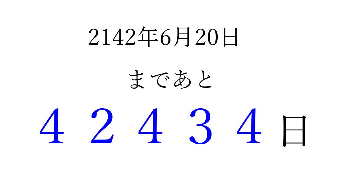 2142年6月20日(水)まで あと 99999 日です 追加すると、トップページからすぐ選べるようになります ※2026/04/15現在の結果です。 最新の状態に更新する ↓シェアして、タイムライン上にカウントダウンを表示しよう!↓ 📤 この結果を共有する Tweet シェア Threads Bluesky 別の日付でカウントダウン 2142年6月のカレンダー このページをブックマークに追加すると、いつでもカウントダウンを確認できます。 (PC: Ctrl+D / Mac: ⌘+D) hitome-notes.comでは以下のページも運営しています。 指定日と期間から日付を計算 | ガチャ確率計算・シミュレーション | プライバシー・ポリシー 運営者:Avocado