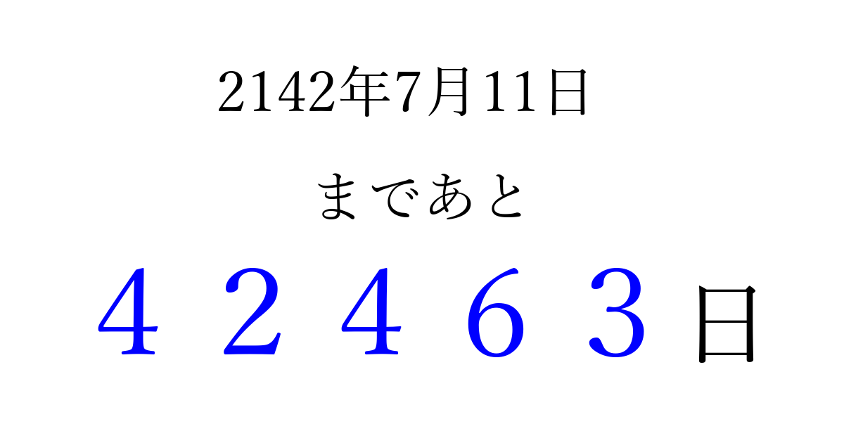 2142年7月11日(水)まで あと 99999 日です 追加すると、トップページからすぐ選べるようになります ※2026/04/07現在の結果です。 最新の状態に更新する ↓シェアして、タイムライン上にカウントダウンを表示しよう!↓ 📤 この結果を共有する Tweet シェア Threads Bluesky 別の日付でカウントダウン 2142年7月のカレンダー このページをブックマークに追加すると、いつでもカウントダウンを確認できます。 (PC: Ctrl+D / Mac: ⌘+D) hitome-notes.comでは以下のページも運営しています。 指定日と期間から日付を計算 | ガチャ確率計算・シミュレーション | プライバシー・ポリシー 運営者:Avocado