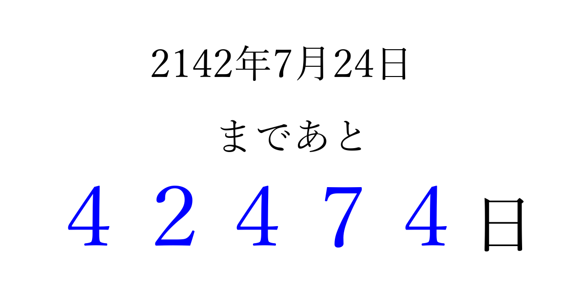 2142年7月24日(火)まで あと 99999 日です 追加すると、トップページからすぐ選べるようになります ※2026/04/09現在の結果です。 最新の状態に更新する ↓シェアして、タイムライン上にカウントダウンを表示しよう!↓ 📤 この結果を共有する Tweet シェア Threads Bluesky 別の日付でカウントダウン 2142年7月のカレンダー このページをブックマークに追加すると、いつでもカウントダウンを確認できます。 (PC: Ctrl+D / Mac: ⌘+D) hitome-notes.comでは以下のページも運営しています。 指定日と期間から日付を計算 | ガチャ確率計算・シミュレーション | プライバシー・ポリシー 運営者:Avocado
