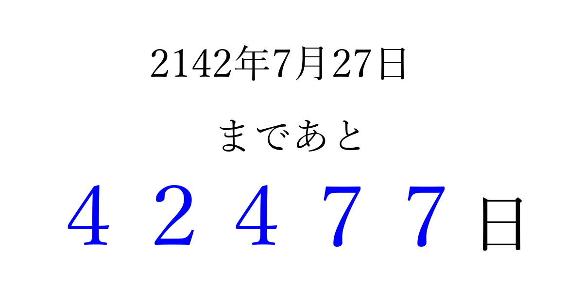 2142年7月27日(金)まで あと 99999 日です 追加すると、トップページからすぐ選べるようになります ※2026/04/09現在の結果です。 最新の状態に更新する ↓シェアして、タイムライン上にカウントダウンを表示しよう!↓ 📤 この結果を共有する Tweet シェア Threads Bluesky 別の日付でカウントダウン 2142年7月のカレンダー このページをブックマークに追加すると、いつでもカウントダウンを確認できます。 (PC: Ctrl+D / Mac: ⌘+D) hitome-notes.comでは以下のページも運営しています。 指定日と期間から日付を計算 | ガチャ確率計算・シミュレーション | プライバシー・ポリシー 運営者:Avocado