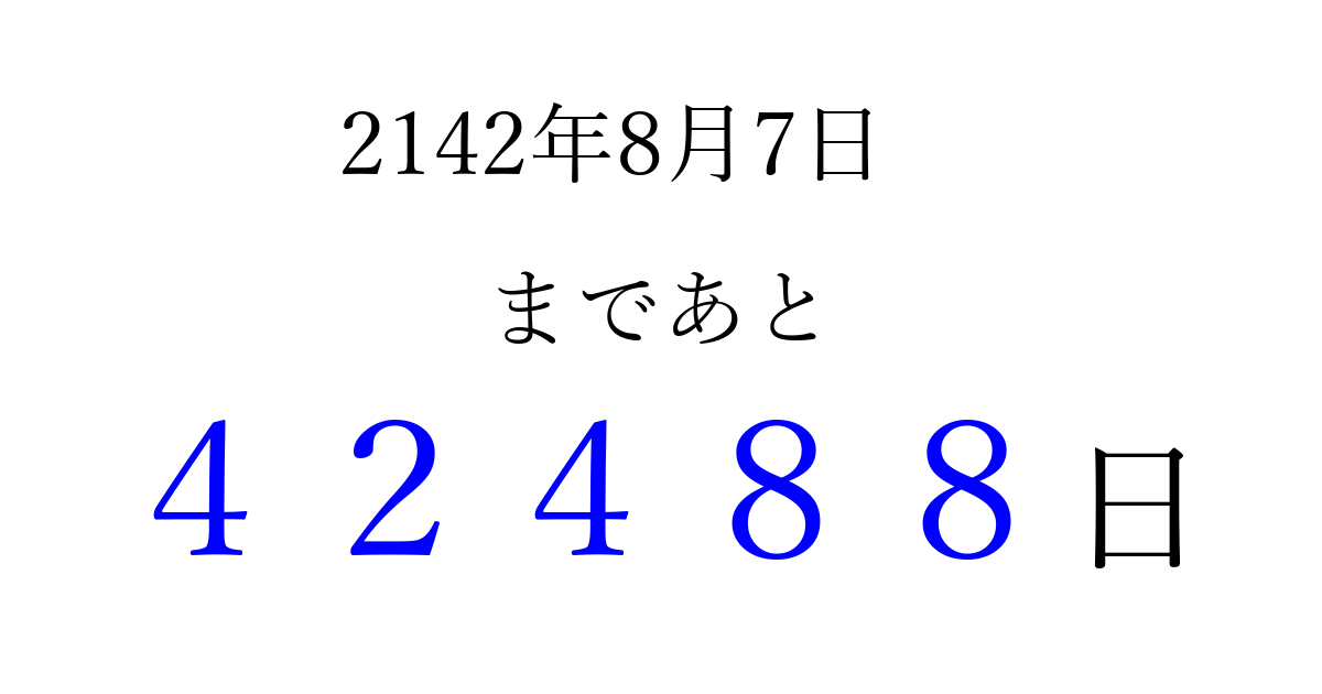 2142年8月7日(火)まで あと 99999 日です 追加すると、トップページからすぐ選べるようになります ※2026/04/09現在の結果です。 最新の状態に更新する ↓シェアして、タイムライン上にカウントダウンを表示しよう!↓ 📤 この結果を共有する Tweet シェア Threads Bluesky 別の日付でカウントダウン 2142年8月のカレンダー このページをブックマークに追加すると、いつでもカウントダウンを確認できます。 (PC: Ctrl+D / Mac: ⌘+D) hitome-notes.comでは以下のページも運営しています。 指定日と期間から日付を計算 | ガチャ確率計算・シミュレーション | プライバシー・ポリシー 運営者:Avocado