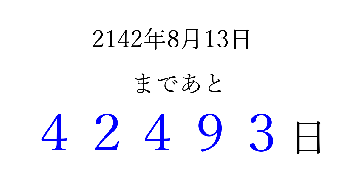 2142年8月13日(月)まで あと 99999 日です 追加すると、トップページからすぐ選べるようになります ※2026/04/10現在の結果です。 最新の状態に更新する ↓シェアして、タイムライン上にカウントダウンを表示しよう!↓ 📤 この結果を共有する Tweet シェア Threads Bluesky 別の日付でカウントダウン 2142年8月のカレンダー このページをブックマークに追加すると、いつでもカウントダウンを確認できます。 (PC: Ctrl+D / Mac: ⌘+D) hitome-notes.comでは以下のページも運営しています。 指定日と期間から日付を計算 | ガチャ確率計算・シミュレーション | プライバシー・ポリシー 運営者:Avocado