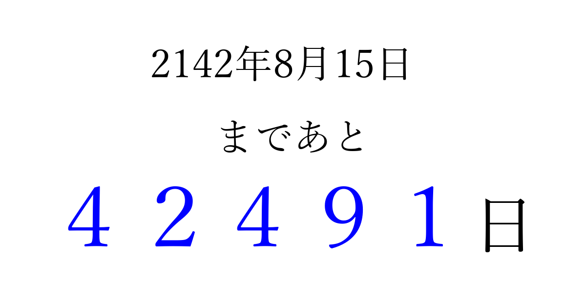 2142年8月15日(水)まで あと 99999 日です 追加すると、トップページからすぐ選べるようになります ※2026/04/14現在の結果です。 最新の状態に更新する ↓シェアして、タイムライン上にカウントダウンを表示しよう!↓ 📤 この結果を共有する Tweet シェア Threads Bluesky 別の日付でカウントダウン 2142年8月のカレンダー このページをブックマークに追加すると、いつでもカウントダウンを確認できます。 (PC: Ctrl+D / Mac: ⌘+D) hitome-notes.comでは以下のページも運営しています。 指定日と期間から日付を計算 | ガチャ確率計算・シミュレーション | プライバシー・ポリシー 運営者:Avocado