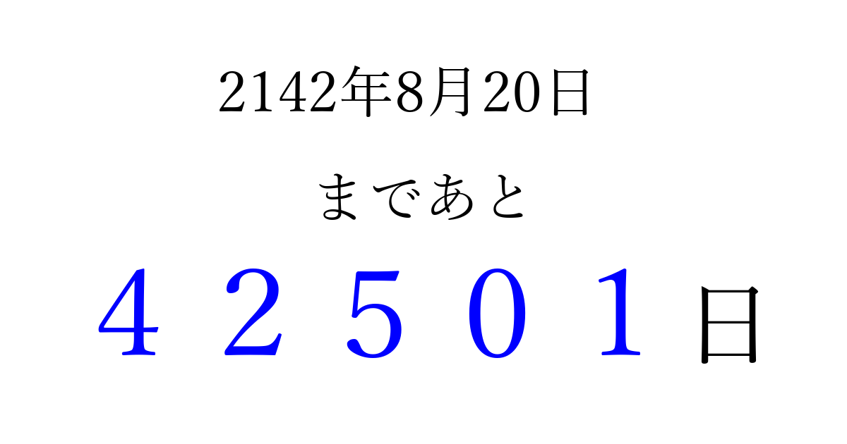 2142年8月20日(月)まで あと 99999 日です 追加すると、トップページからすぐ選べるようになります ※2026/04/09現在の結果です。 最新の状態に更新する ↓シェアして、タイムライン上にカウントダウンを表示しよう!↓ 📤 この結果を共有する Tweet シェア Threads Bluesky 別の日付でカウントダウン 2142年8月のカレンダー このページをブックマークに追加すると、いつでもカウントダウンを確認できます。 (PC: Ctrl+D / Mac: ⌘+D) hitome-notes.comでは以下のページも運営しています。 指定日と期間から日付を計算 | ガチャ確率計算・シミュレーション | プライバシー・ポリシー 運営者:Avocado