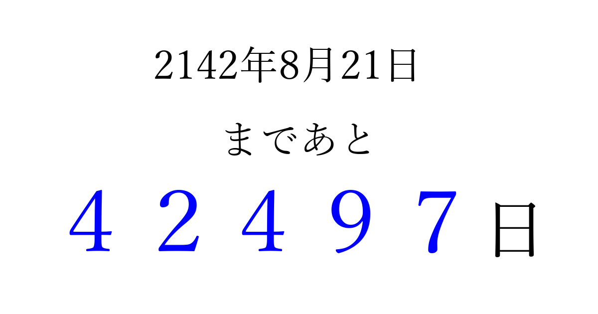 2142年8月21日(火)まで あと 99999 日です 追加すると、トップページからすぐ選べるようになります ※2026/04/14現在の結果です。 最新の状態に更新する ↓シェアして、タイムライン上にカウントダウンを表示しよう!↓ 📤 この結果を共有する Tweet シェア Threads Bluesky 別の日付でカウントダウン 2142年8月のカレンダー このページをブックマークに追加すると、いつでもカウントダウンを確認できます。 (PC: Ctrl+D / Mac: ⌘+D) hitome-notes.comでは以下のページも運営しています。 指定日と期間から日付を計算 | ガチャ確率計算・シミュレーション | プライバシー・ポリシー 運営者:Avocado