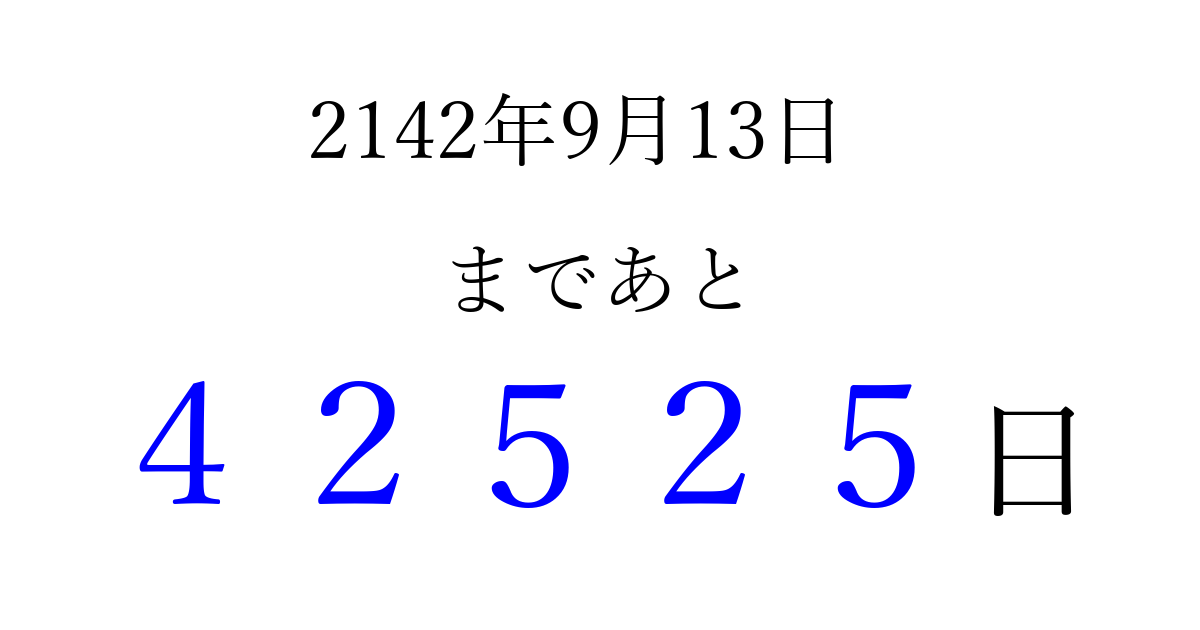 2142年9月13日(木)まで あと 99999 日です 追加すると、トップページからすぐ選べるようになります ※2026/04/09現在の結果です。 最新の状態に更新する ↓シェアして、タイムライン上にカウントダウンを表示しよう!↓ 📤 この結果を共有する Tweet シェア Threads Bluesky 別の日付でカウントダウン 2142年9月のカレンダー このページをブックマークに追加すると、いつでもカウントダウンを確認できます。 (PC: Ctrl+D / Mac: ⌘+D) hitome-notes.comでは以下のページも運営しています。 指定日と期間から日付を計算 | ガチャ確率計算・シミュレーション | プライバシー・ポリシー 運営者:Avocado