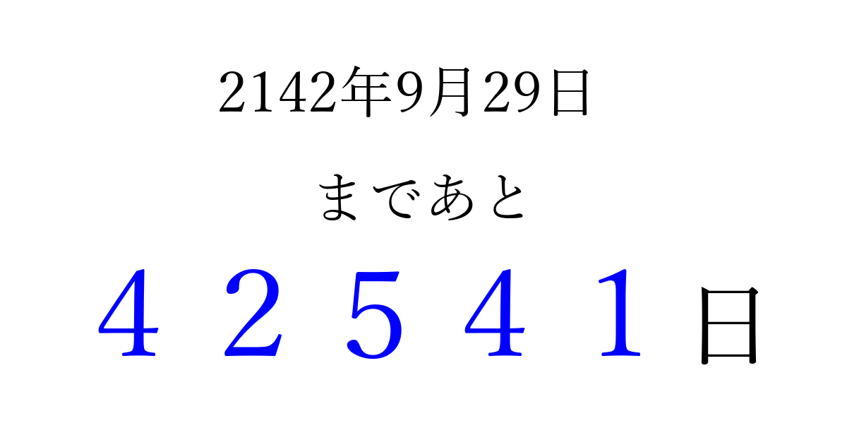 2142年9月29日(土)まで あと 99999 日です 追加すると、トップページからすぐ選べるようになります ※2026/04/09現在の結果です。 最新の状態に更新する ↓シェアして、タイムライン上にカウントダウンを表示しよう!↓ 📤 この結果を共有する Tweet シェア Threads Bluesky 別の日付でカウントダウン 2142年9月のカレンダー このページをブックマークに追加すると、いつでもカウントダウンを確認できます。 (PC: Ctrl+D / Mac: ⌘+D) hitome-notes.comでは以下のページも運営しています。 指定日と期間から日付を計算 | ガチャ確率計算・シミュレーション | プライバシー・ポリシー 運営者:Avocado
